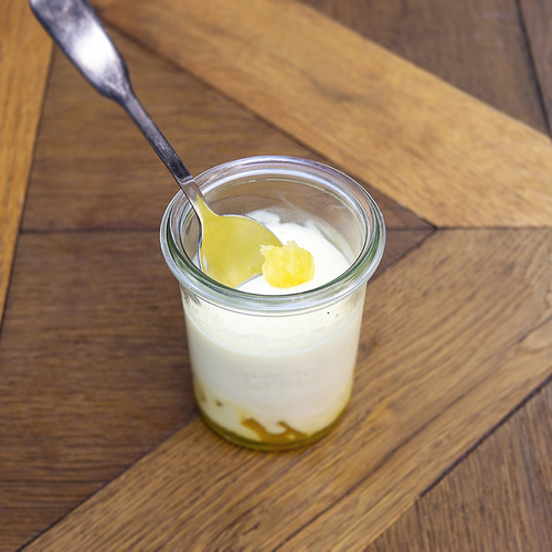 Panacotta maison 75% (crème fraîche liquide [LAIT], sucre vanillé, feuilles de gélatine), Préparation ananas 25% (ananas frais, jus d’orange frais, sucre S2, feuille de gélatine, gingembre en poudre, canelle, muscade, safran en poudre, sucre vanillé, gousse de vanille),