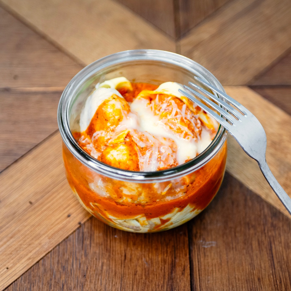 Boulettes de volaille 62% (Chair de cuisse de poulet, OEUFS, épices [protéines de SOJA, sel, paprika, curry (MOUTARDE), amidon de BLE, poivre, pili-pili, muscade, romarin, graines de CELERI], Sauce à l’orange basilic 38% (oignons, échalotes, ail, carottes, bouillon de poule en pâte, jus d’orange, coulis de tomate, poivre à l’orange (MOUTARDE), sel, basilic), Purée de pommes de terre (pommes de terre, LAIT entier, BEURRE, sel, muscade, sel, poivre), LAIT.