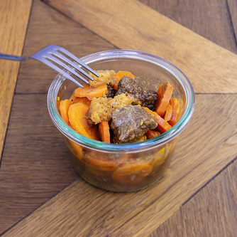 Carbonnade de boeuf 69% (viande de boeuf, bière Rodenbach (ORGE) et bière Cuvée des Trolls (ORGE), oignons, roux brun (Farine de BLE, graisse de palme, colorant (E150c).), jus de veau lié (farine de BLE), MOUTARDE, pain d’épices ( farine et son de SEIGLE), thym, laurier, sel, poivre, muscade), huile d’olive, fleur de sel), Pruneaux dénoyautés 3%.