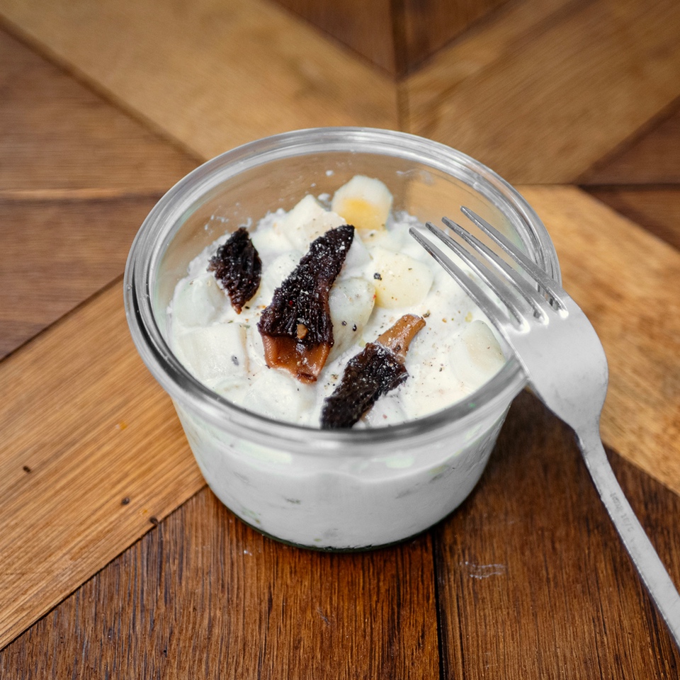 Poulet jaune, Morilles, Asperges blanches, Crème fraîche (LAIT), Vin blanc (SULFITES), Roux blanc (GLUTEN), Sel, Poivre citronné