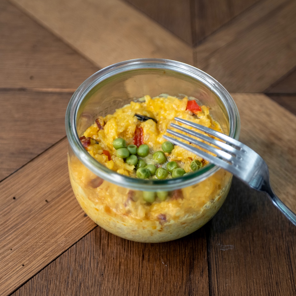 Riz risotto 45%, MOULES décortiquées 12%, Chorizo 9% (viande de porc, sel, paprika, LAIT en poudre, protéine de SOJA, sucre, ail, dextrine, dextrose, épices. Crème végétale 6% (LAIT), Parmesan 6% (LAIT), Mascarpone 6% (LAIT), Poivrons rouges 5%, Poivrons jaunes 3%,Vin blanc 3% (SULFITES), Oignons 2%, Petits pois 2%, BEURRE, Epices paëlla (Sel, curcuma, paprika, ail, LACTOSE, dextrose, oignon, curry (coriandre, curcuma, moutarde, farine de pois chiche, cumin, poivre noir, pili-pili, ail, fenugrec, fenouil, clou de girofle, cardamone, sel), arôme), Jus de MOULES, Ail.