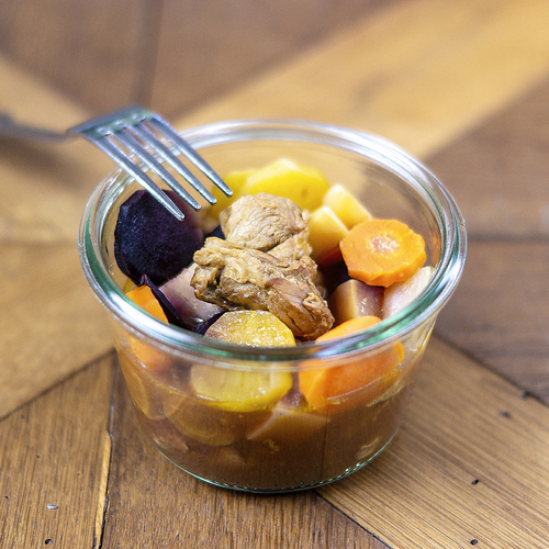 Veau 36%, Jus de Clémentine 22%, Eau 22%, Carottes 6%, Catottes jaunes 3%, Carottes mauves 3%, Oignons 3%, Navets boule d’or 3%, Panais 3%, Mandarine Napoleon.