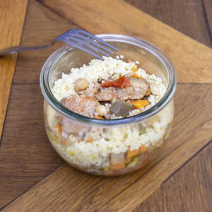 Riz 33%, Viande de porc 27%, Sauce Marchand de vin 18% (eau, échalotes, vin rouge (SULFITES), jus de veau brun lié (fécule de pomme de terre, sel, graisse de poule, oignons, tomates, maltodextrose, amidon modifié de maïs, extrait de levure, sirop de glucose, arômes, sucre, viande de veau, farine de BLE, extrait de viande de boeuf, gomme de guar, extrait de chicorée, ail, colorant, extrait de vin blanc, extraits d’épices, extraits de romarin), roux blanc (farine de BLE, graisse de palme), sauce demi glace (amidon modifié, farine de BLE arômes (avec CELERI), tomate, sel, protéines de BLE hydrolysé (protéines de BLE, sel), sucre, extrait de levure, maltodextrine, huile végétae (tournesol, palme), extrait de chicorée), patrelle, sel, poivre, muscade), Poivrons rouges et jaunes 9%, Oignons cébette 3%, Pousse de bambou 3%, Carotes 2%, Sauce SOJA 2%, BEURRE, Oignons, CACAHUETES salés, Pâte d’ARACHIDE, Gingembre, Huile d’olive, Ail, Piment rouge, Romarin.